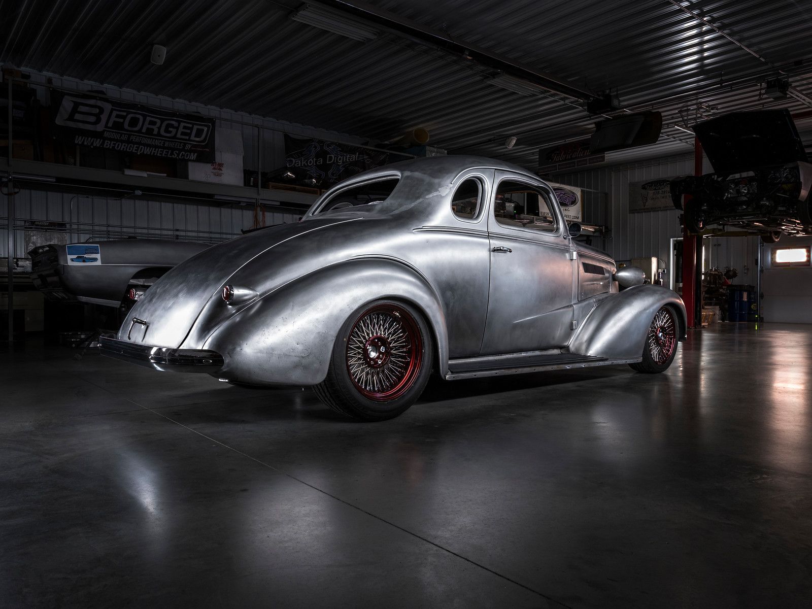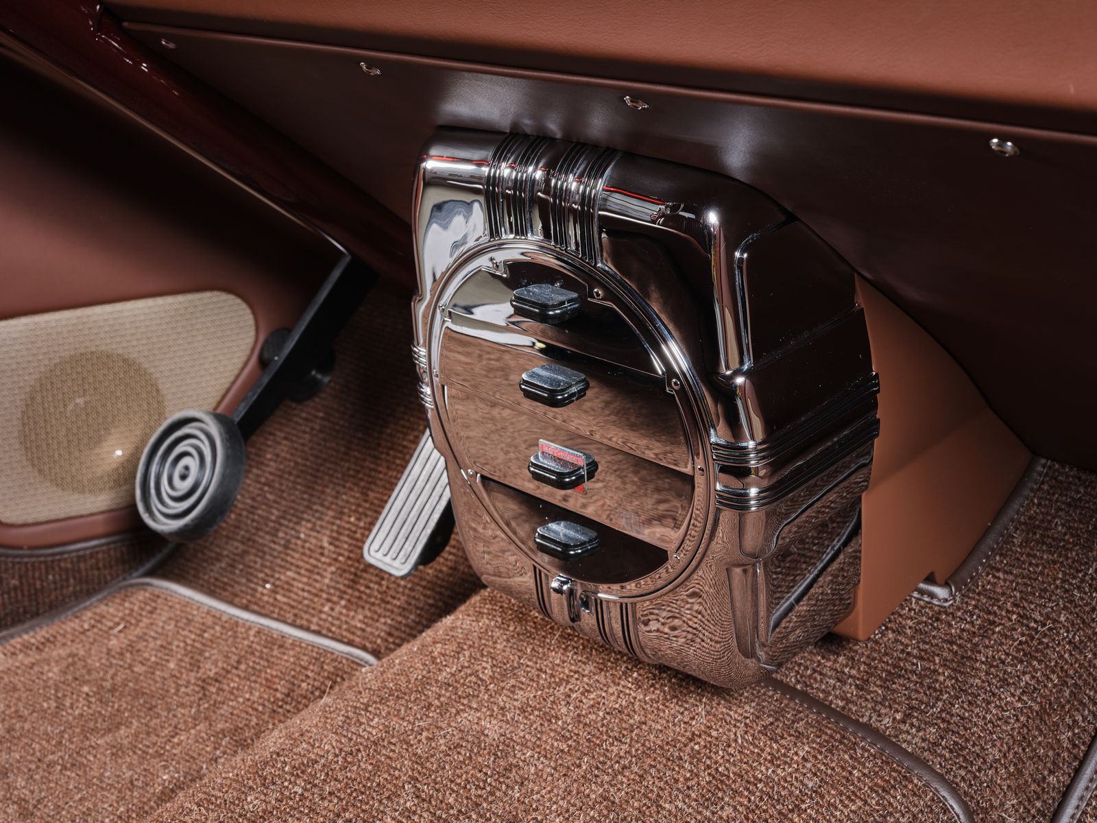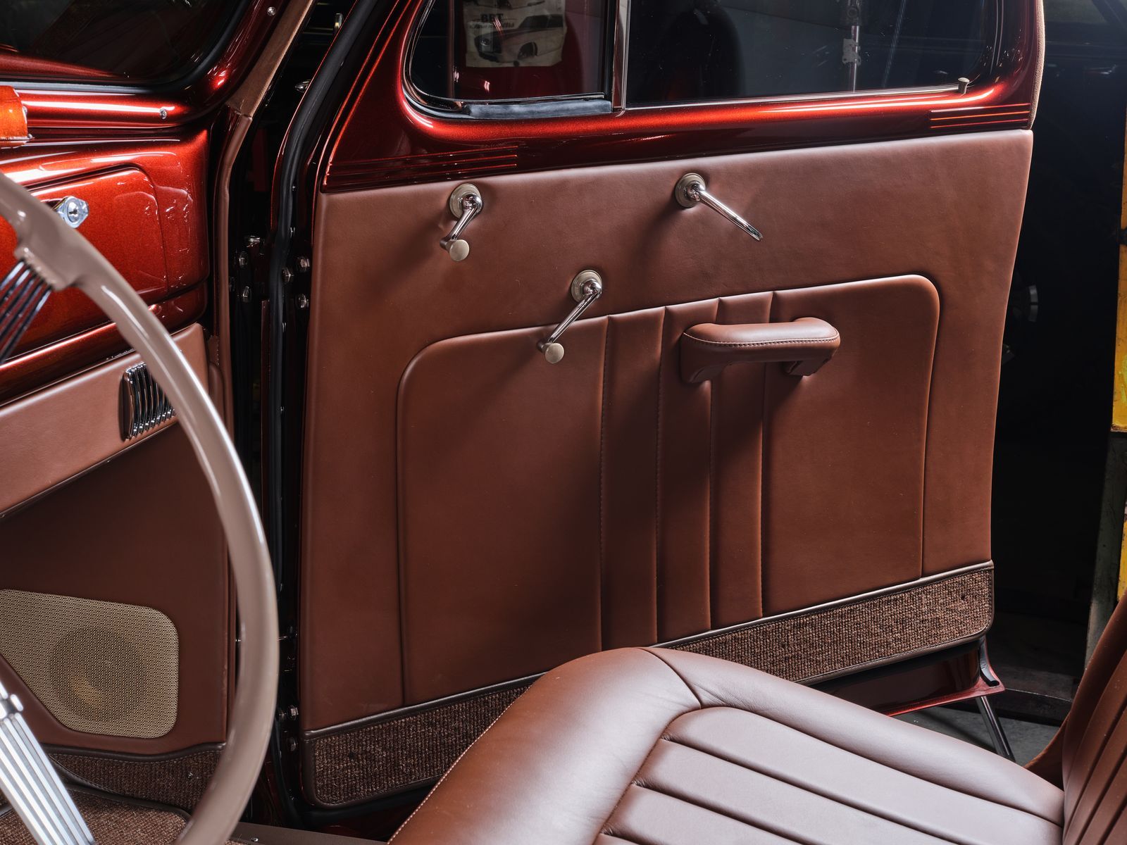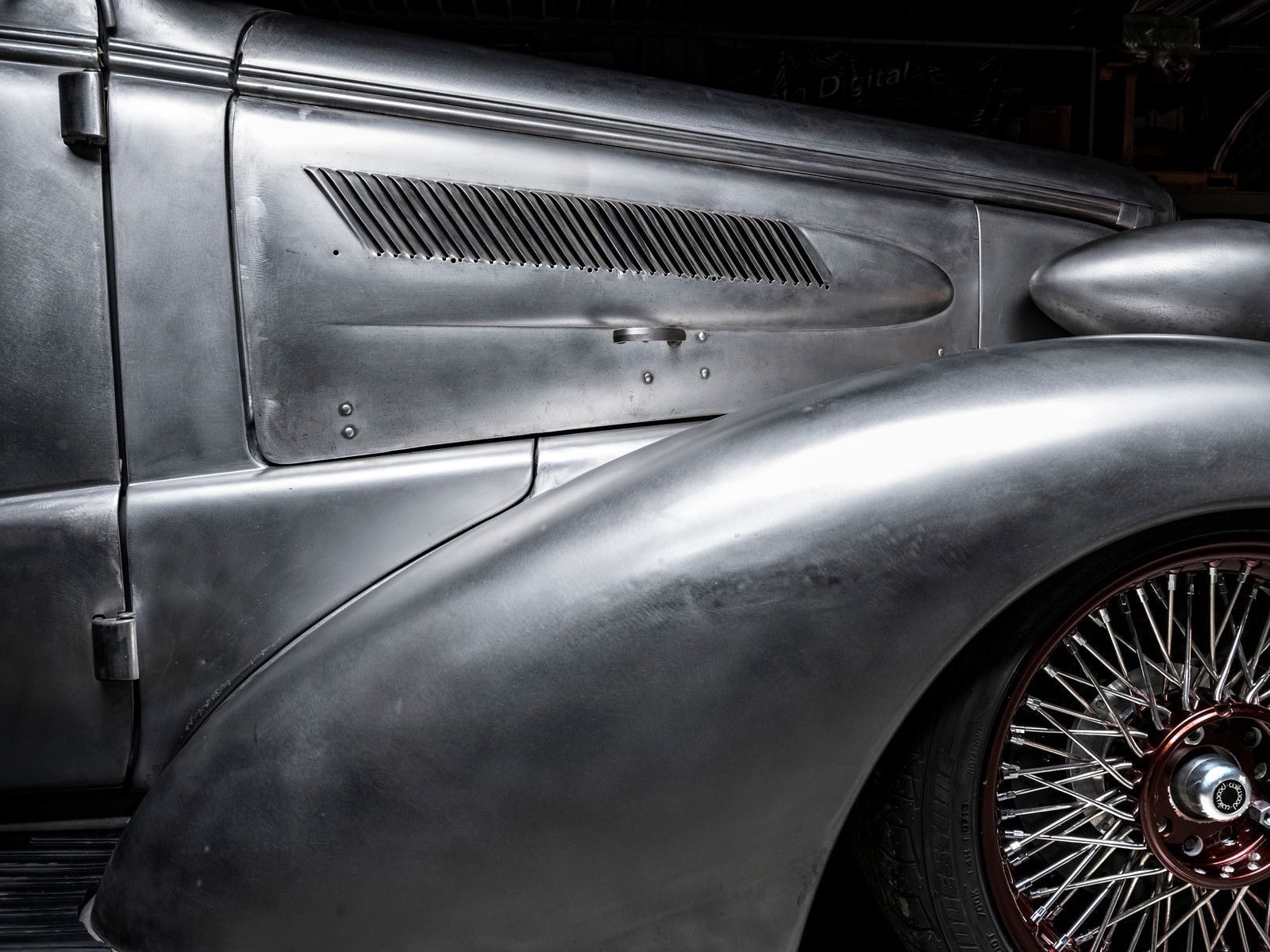 Hammered. Welded. Smoothed. Tucked. Machined. A lot. This '37 features extensive machining due to the high amount of art deco-themed details throughout the car. From it's repurposed heater and delicate interior trim pieces to its elegant hood ornament, waterfall grill and beautiful accent trim, there is an incredible amount of custom fabrication even for the pieces that don't look customized...which is kind of the point of this build. Backing up its classically gorgeous lines is an equally classic powertrain, a strong, though not silent, LS engine and trans combo built to move this pre-war, custom classic with the authority and confidence its looks exude.