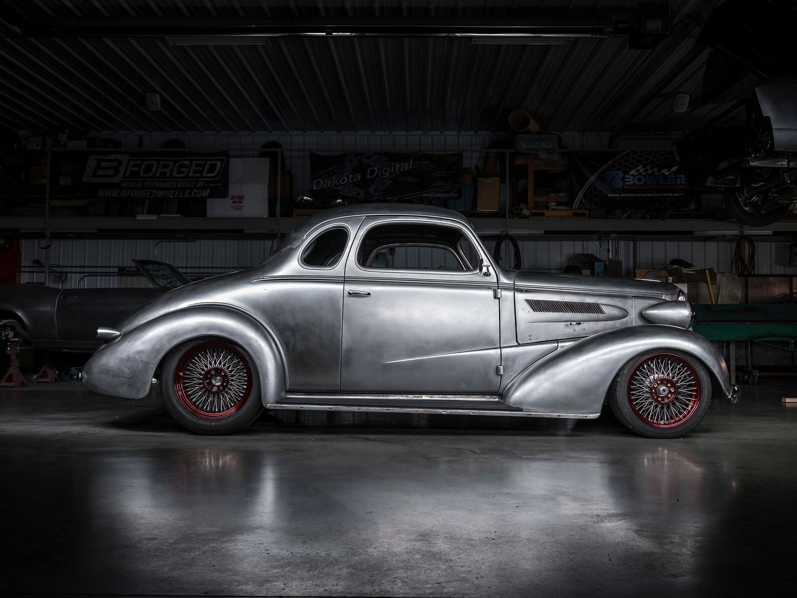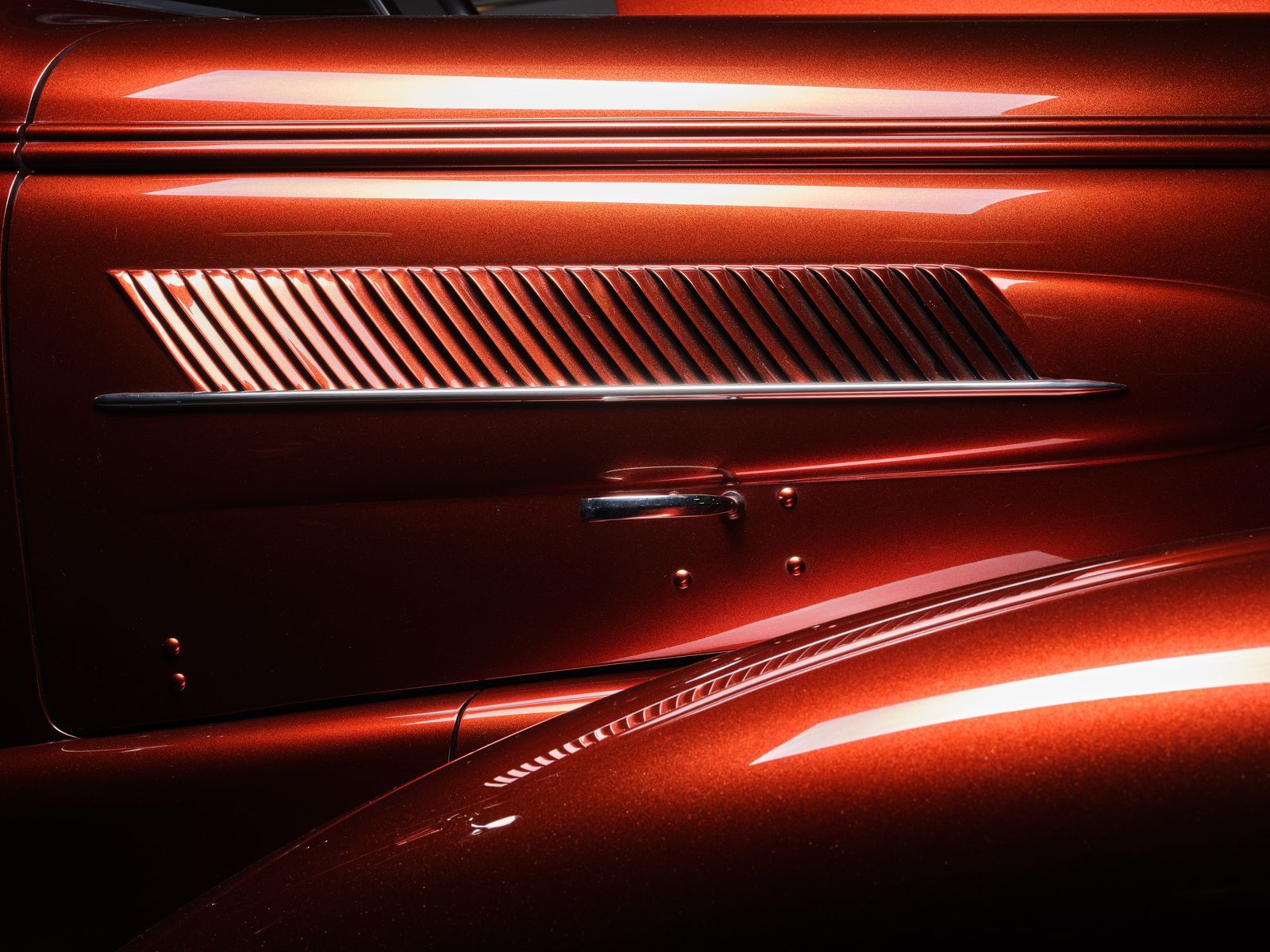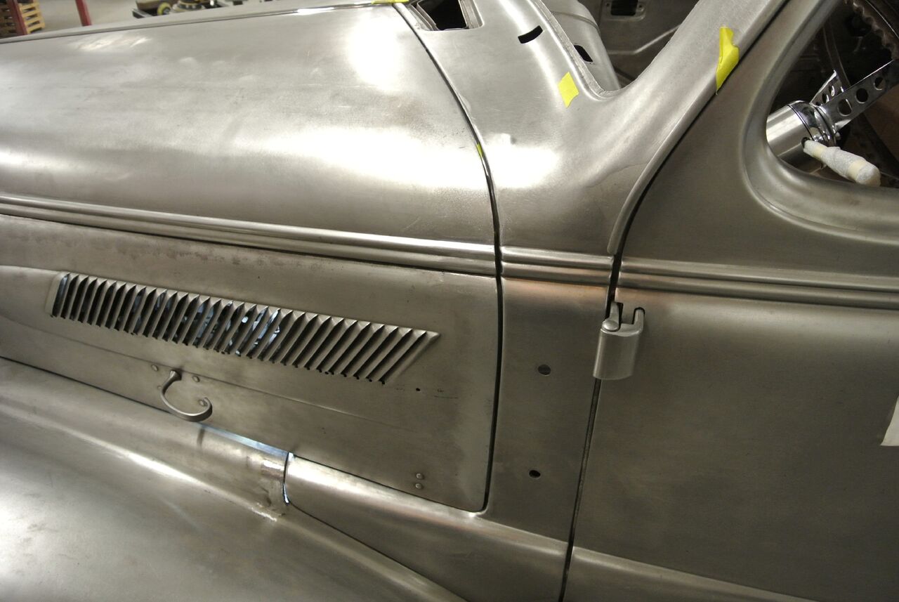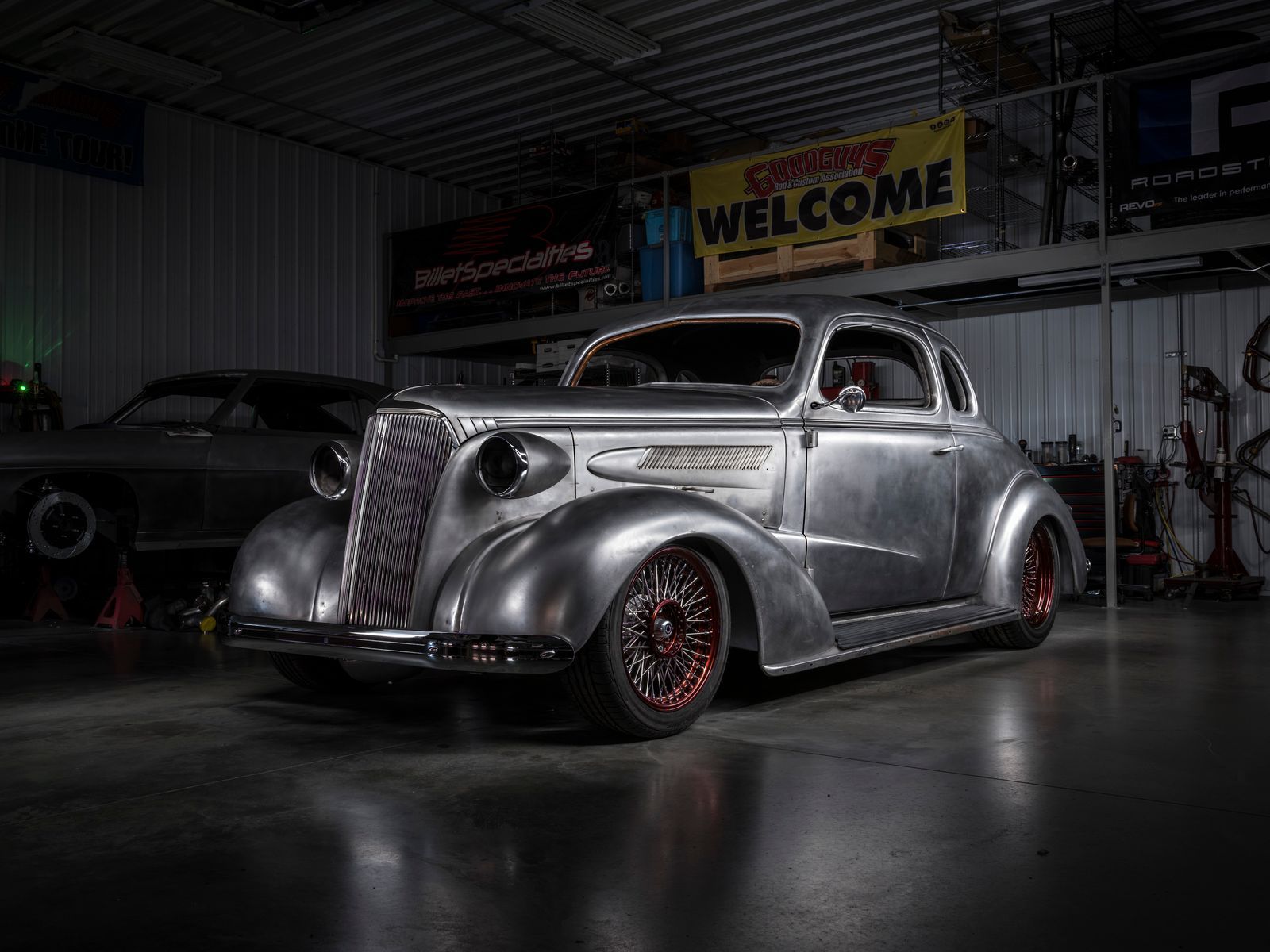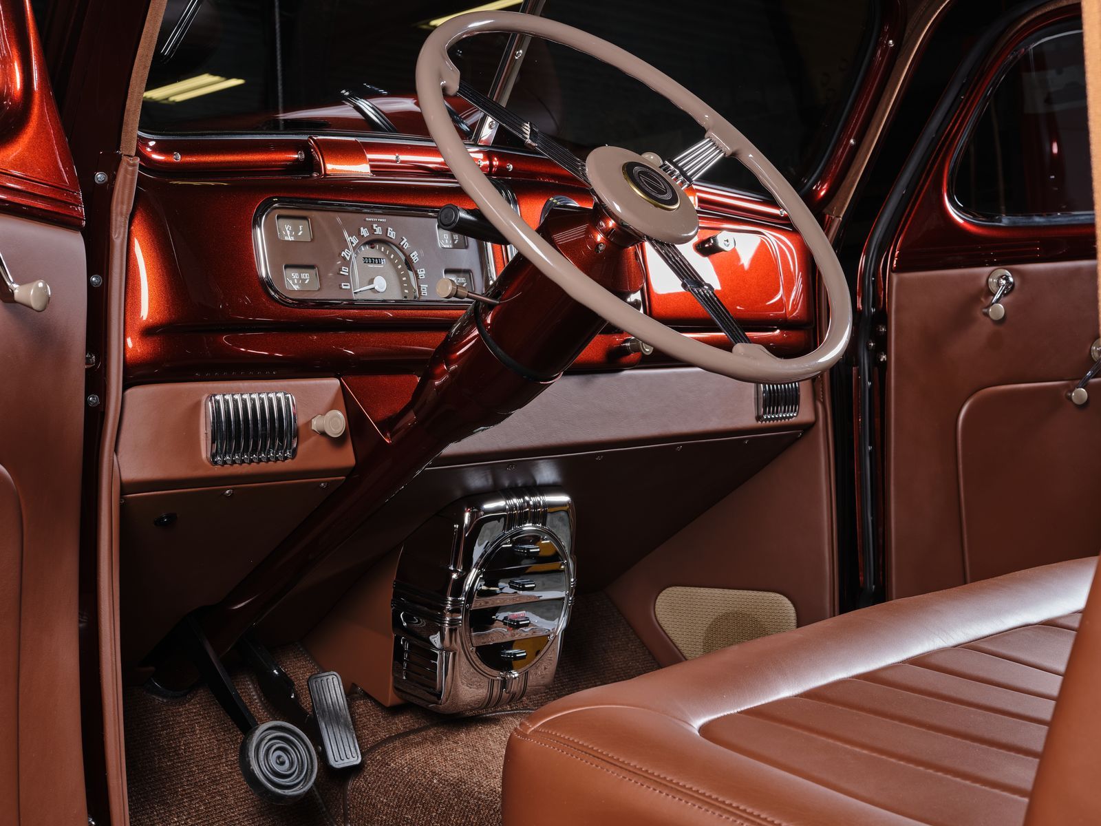 Hammered. Welded. Smoothed. Tucked. Machined. A lot. This '37 features extensive machining due to the high amount of art deco-themed details throughout the car. From it's repurposed heater and delicate interior trim pieces to its elegant hood ornament, waterfall grill and beautiful accent trim, there is an incredible amount of custom fabrication even for the pieces that don't look customized...which is kind of the point of this build. Backing up its classically gorgeous lines is an equally classic powertrain, a strong, though not silent, LS engine and trans combo built to move this pre-war, custom classic with the authority and confidence its looks exude.