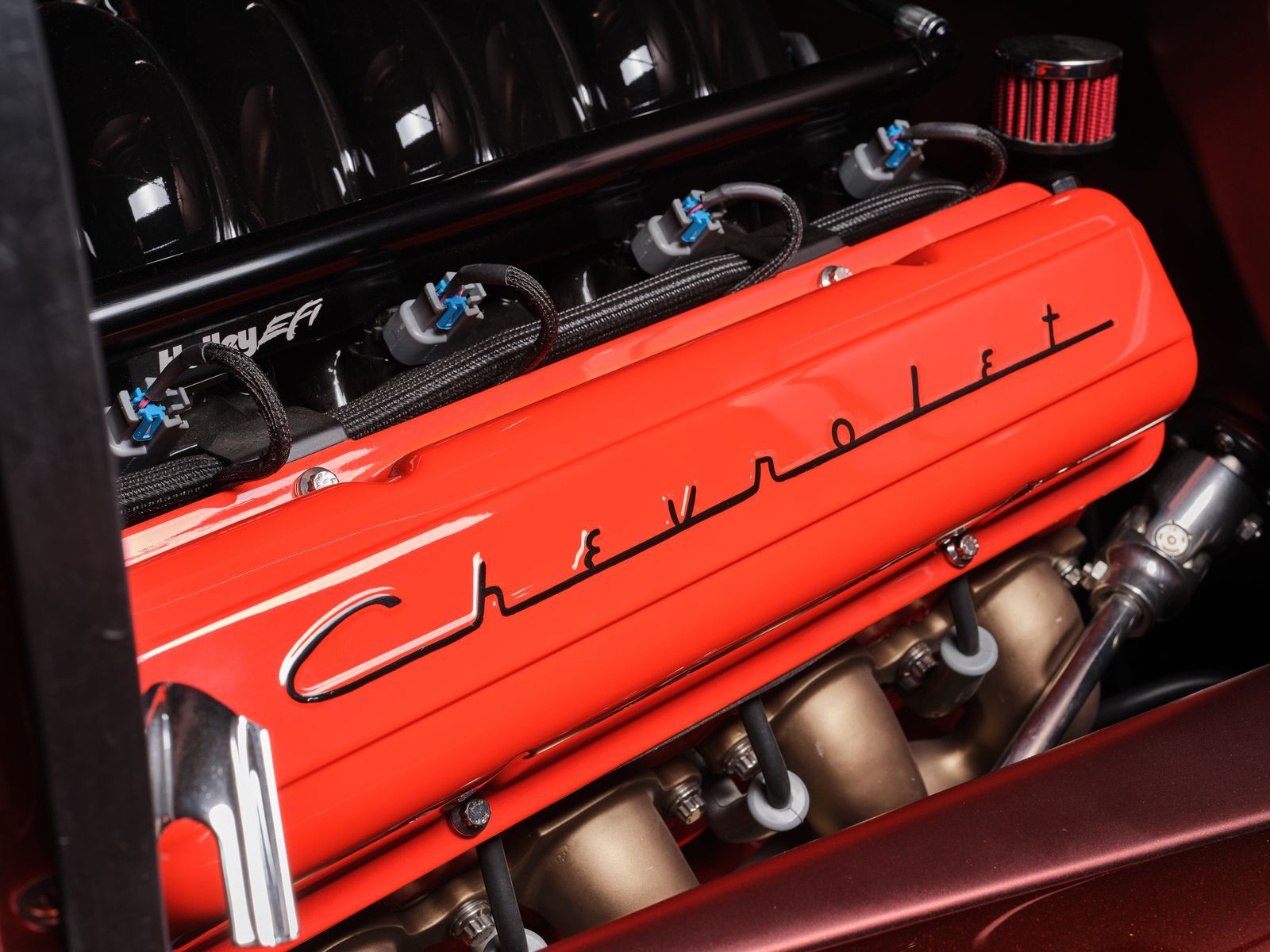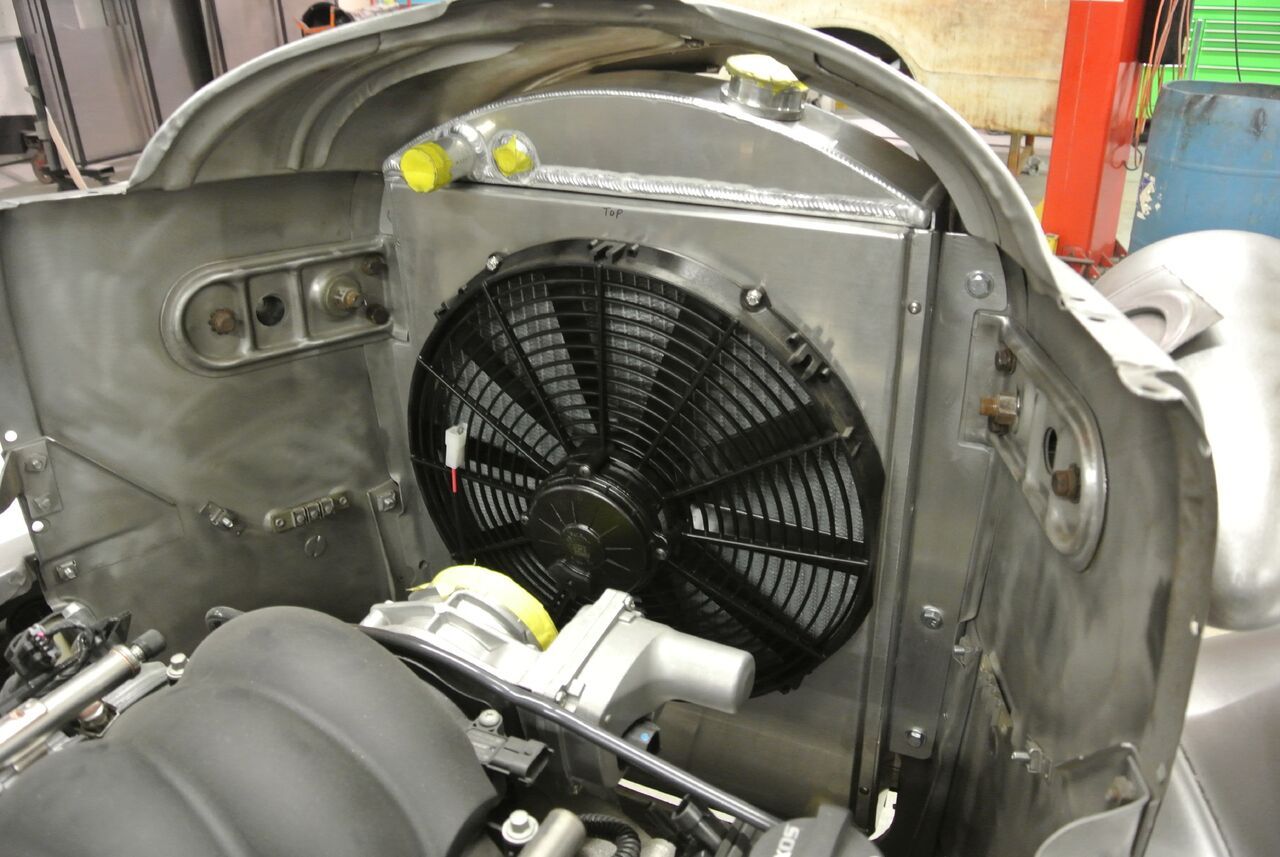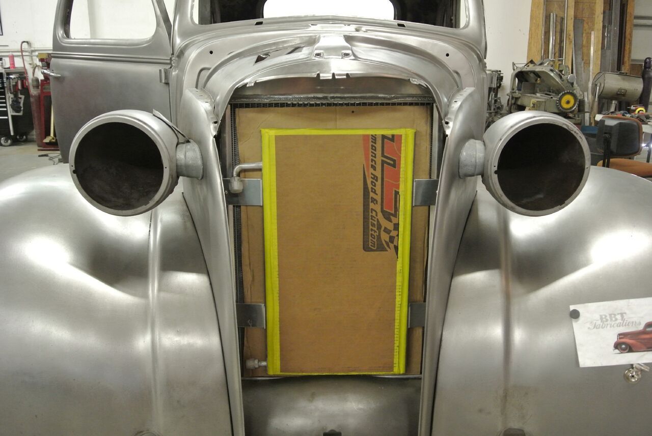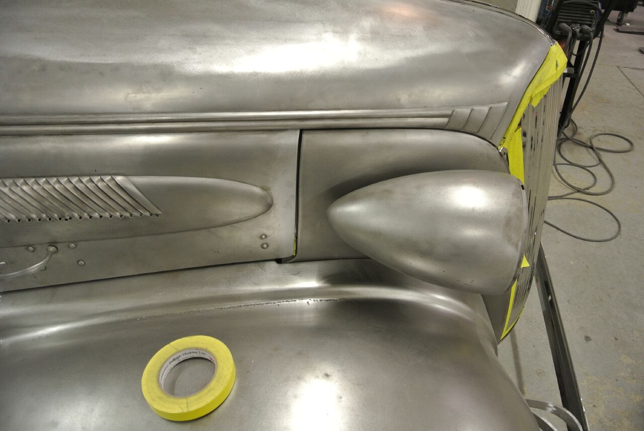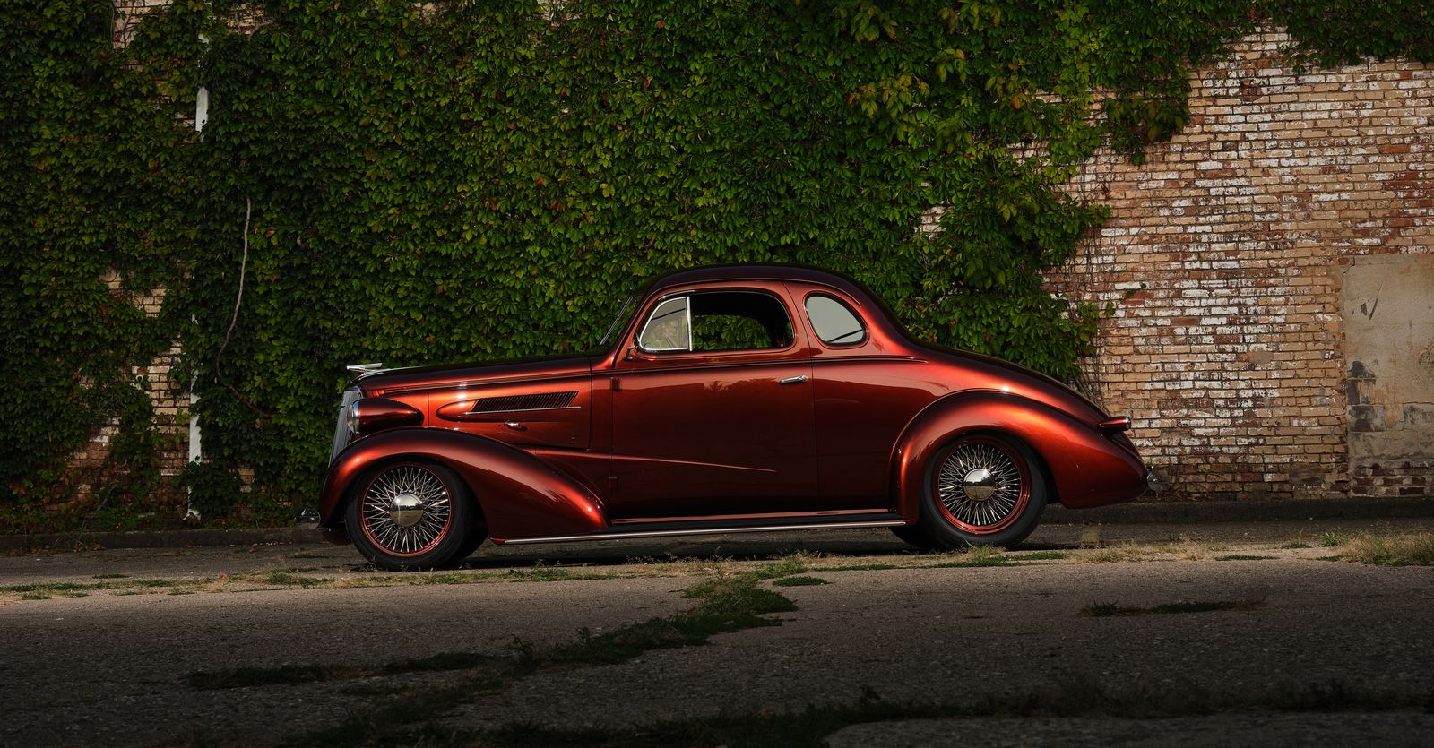 Hammered. Welded. Smoothed. Tucked. Machined. A lot. This '37 features extensive machining due to the high amount of art deco-themed details throughout the car. From it's repurposed heater and delicate interior trim pieces to its elegant hood ornament, waterfall grill and beautiful accent trim, there is an incredible amount of custom fabrication even for the pieces that don't look customized...which is kind of the point of this build. Backing up its classically gorgeous lines is an equally classic powertrain, a strong, though not silent, LS engine and trans combo built to move this pre-war, custom classic with the authority and confidence its looks exude.